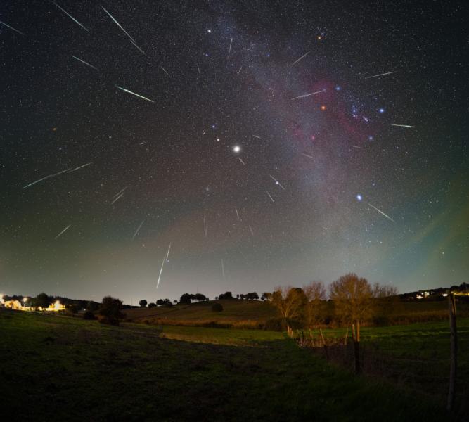 Jupiter, the Solar System's ruling gas giant, is the brightest celestial beacon at the center of this composite night skyscape. The scene was constructed by selecting the 40 exposures containing meteors from about 500 exposures made on the nights of December 13 and 14, near peak activity for this year's annual Geminid meteor shower. With each selected exposure registered in the night sky above Alentejo, Portugal, planet Earth, it does look like the meteors are streaming away from Jupiter. But the apparent radiant of the Geminid meteors is actually closer to bright star Castor, in the shower's eponymous constellation Gemini. In this frame that's just a little above and left of the Solar System's most massive planet. Still, the parent body of Geminid meteors is known to be rocky, near-Earth asteroid 3200 Phaethon. And the orbit of Phaethon itself is influenced by the gravitational attraction exerted by massive Jupiter, in concert with planets of the inner Solar System.