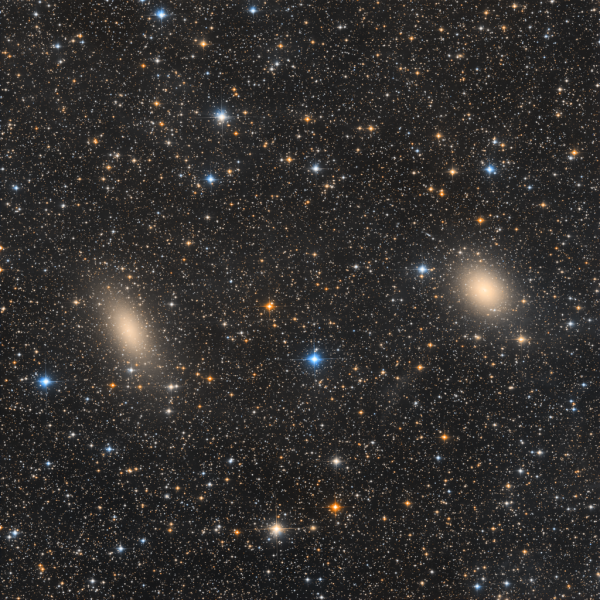 Dwarf galaxies NGC 147 (left) and NGC 185 stand side by side in this deep telescopic portrait. The two are not-often-imaged satellite galaxies of M31, the great spiral Andromeda Galaxy, some 2.5 million light-years away. Their separation on the sky, less than one degree across a pretty field of view toward the constellation Cassiopeia, translates to only about 35 thousand light-years at Andromeda's distance, but Andromeda itself is found well outside this frame. Brighter and more famous satellite galaxies of Andromeda, M32 and M110, are seen much closer to the great spiral. NGC 147 and NGC 185 have been identified as binary galaxies, forming a gravitationally stable binary system. But recently discovered faint dwarf galaxy Cassiopeia II also seems to be part of their system, forming a gravitationally bound group within Andromeda's intriguing population of small satellite galaxies.