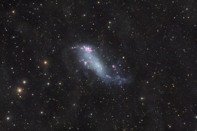 Grand spiral galaxies often seem to get all the glory, flaunting their young, bright, blue star clusters in beautiful, symmetric spiral arms. But small, irregular galaxies form stars too. In fact, dwarf galaxy IC 2574 shows clear evidence of intense star forming activity in its telltale reddish regions of glowing hydrogen gas. Just as in spiral galaxies, the turbulent star-forming regions in IC 2574 are churned by stellar winds and supernova explosions spewing material into the galaxy's interstellar medium and triggering further star formation. A mere 12 million light-years distant, IC 2574 is part of the M81 group of galaxies, seen toward the northern constellation Ursa Major. Also known as Coddington's Nebula, the faint but intriguing island universe is about 50,000 light-years across, discovered by American astronomer Edwin Coddington in 1898.