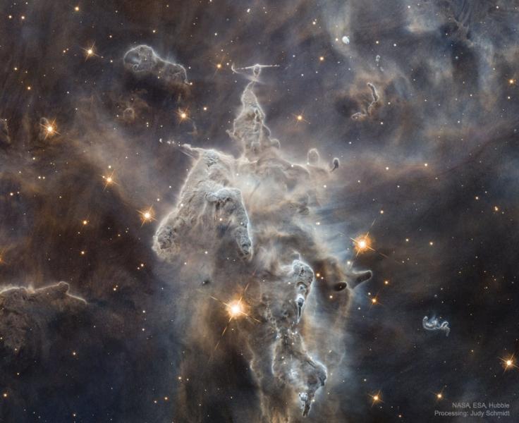 Inside the head of this interstellar monster is a star that is slowly destroying it. The huge monster, actually an inanimate series of pillars of gas and dust, measures light years in length. The in-head star is not itself visible through the opaque interstellar dust but is bursting out partly by ejecting opposing beams of energetic particles called Herbig-Haro jets. Located about 7,500 light years away in the Carina Nebula and known informally as Mystic Mountain, the appearance of these pillars is dominated by dark dust even though they are composed mostly of clear hydrogen gas. The featured image was taken with the Hubble Space Telescope. All over these pillars, the energetic light and winds from massive newly formed stars are evaporating and dispersing the dusty stellar nurseries in which they formed. Within a few million years, the head of this giant, as well as most of its body, will have been completely evaporated by internal and surrounding stars.